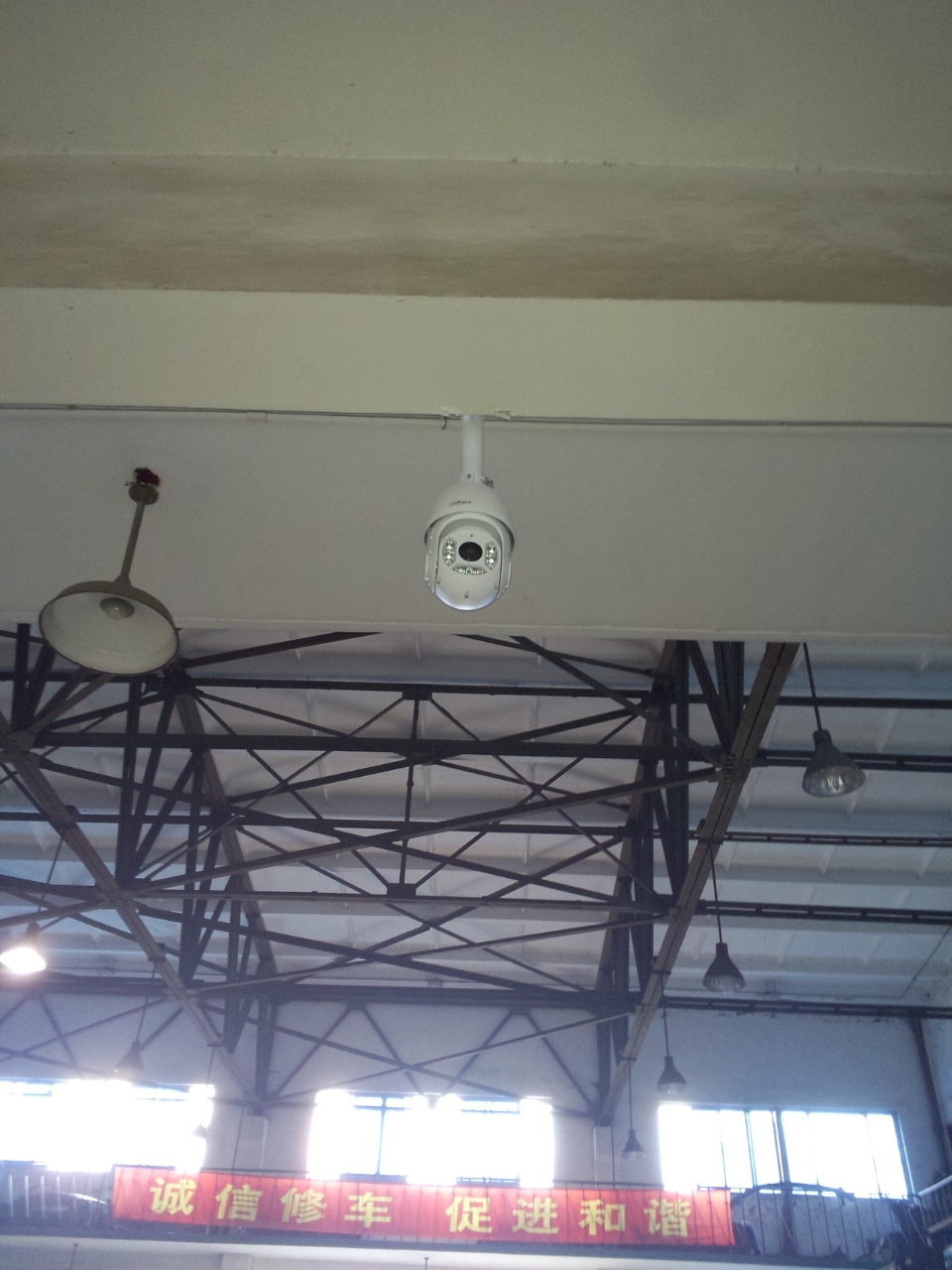 上海市第二十机动车安全检测站,青浦区青安路895号,大华130万高清网络球机监控安装,360度旋转球机了解整个厂区情况,通过23倍焦距放大,100米内地上的一元硬币清晰可见,所有检测线上的车牌都在监视范围内。
