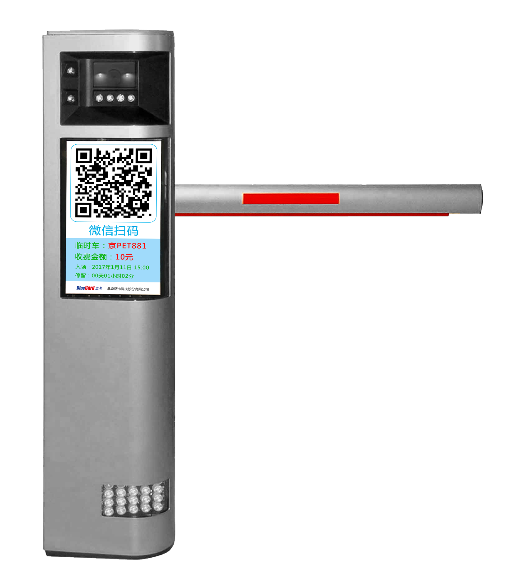 LCD广告屏:可显示车牌、车辆信息、收费金额、二维码、限行提示、物业信息等;