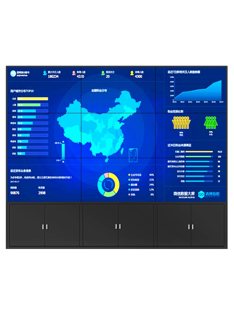 2、大尺寸,采用BOE55寸液晶面板,尺寸更大,同样显示面积所需要的拼接数量更少