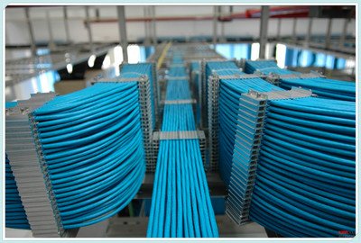 导线槽是为表面安装的水平电缆专门设计的电缆导线槽。在没有预先埋入导线管时,可以利用导线槽来铺设水平电缆,导线槽通常安装在墙壁外部。导线槽是由槽底和盖板组成的,绞接的盖板能非常容易地掀开,取出或安装电缆,然后很轻松地压合。线槽分为金属线槽和塑料线槽两种,在线路连接、转角、分支及终端处应采用相应的附件。线槽内线缆填充率不应大于60%,并保持线槽良好的封闭性高架地板为活动防静电地板,是由许多块木属方板组成的,其方板搁置在房间地面上的锁定支架上,任何一块方板都能活动,以便敷设、拆除和检修。高架地板下的线精分为互相垂直的两组,分别铺设通信电缆和电力电缆,以提高布线系统的抗电磁干扰的性能。如图4所示为高架地板布线示意图。 [5]